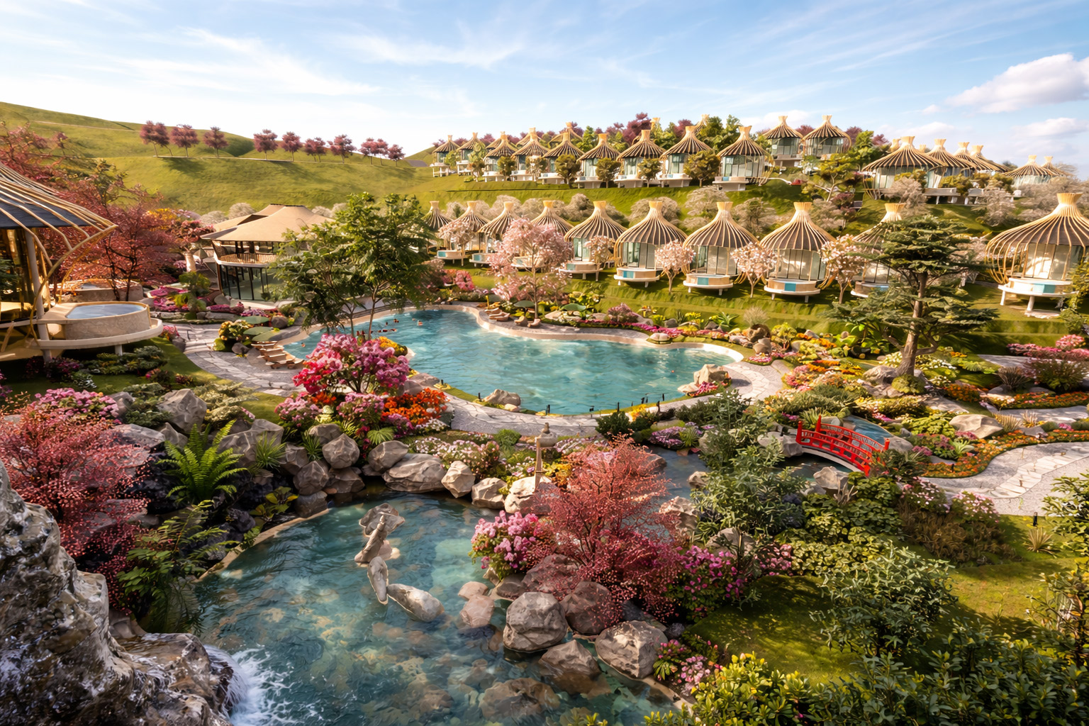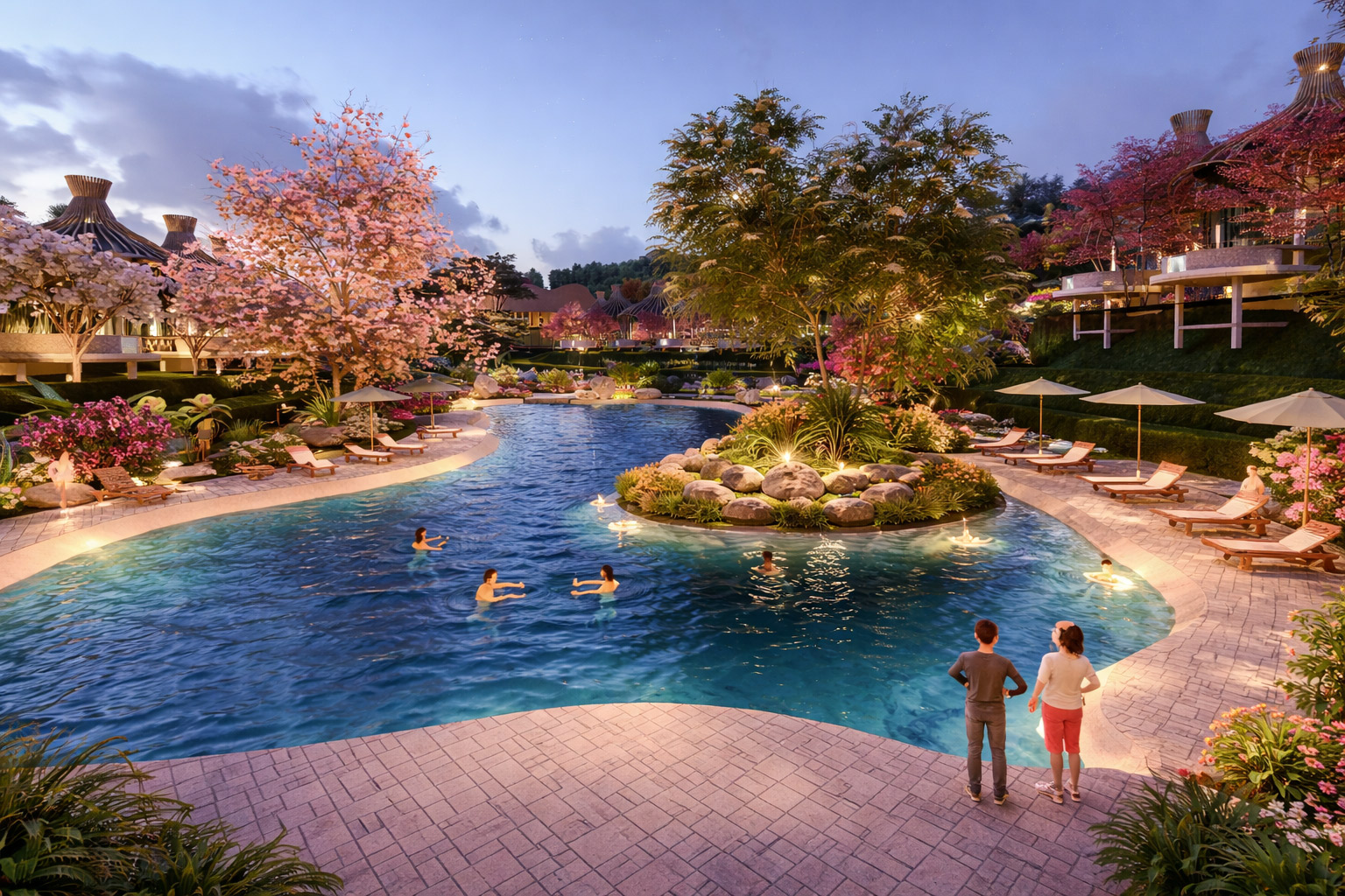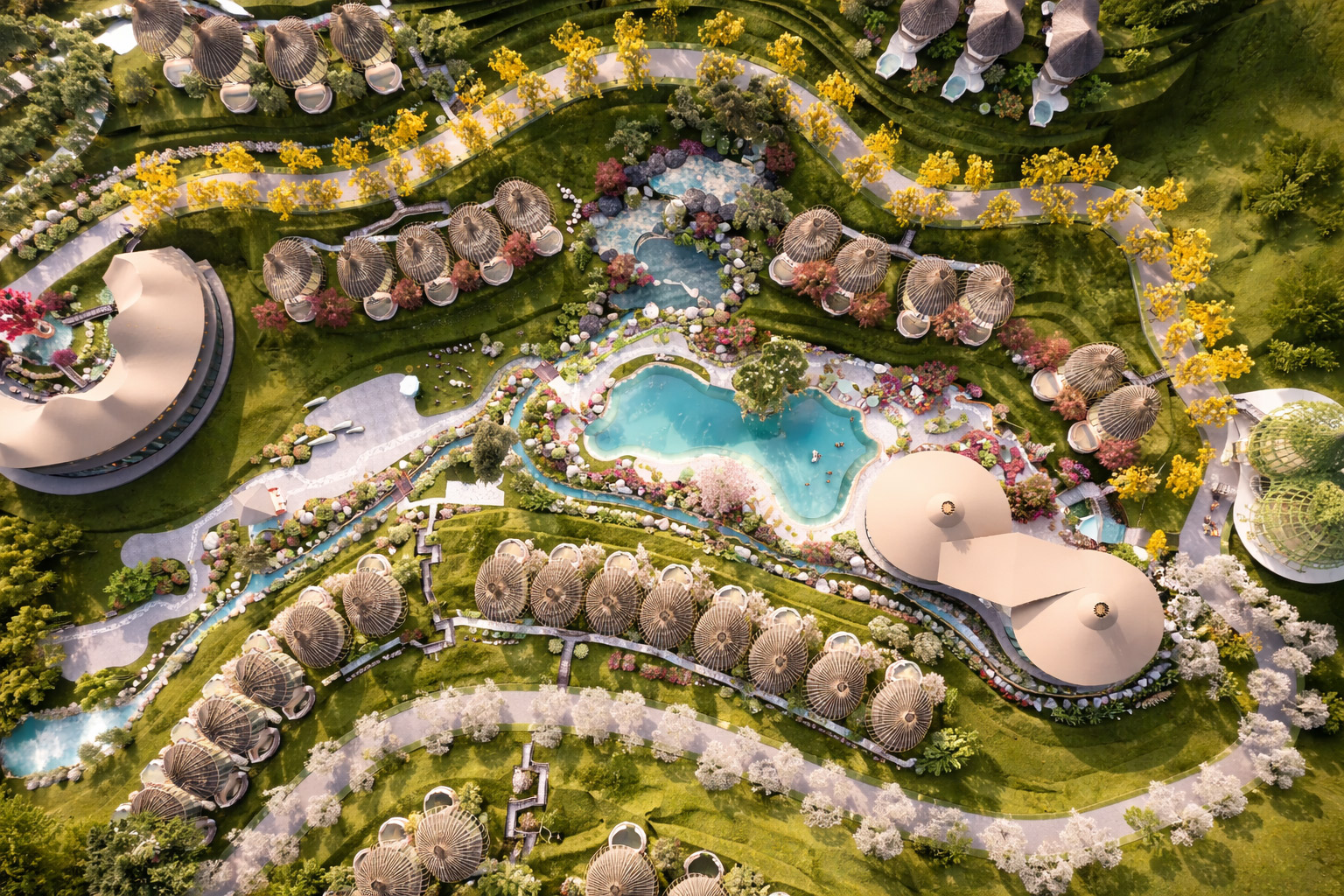 Hệ thống nước (thác – hồ – suối – bể bơi) đóng vai trò như một “trục mềm”, liên kết toàn bộ không gian.