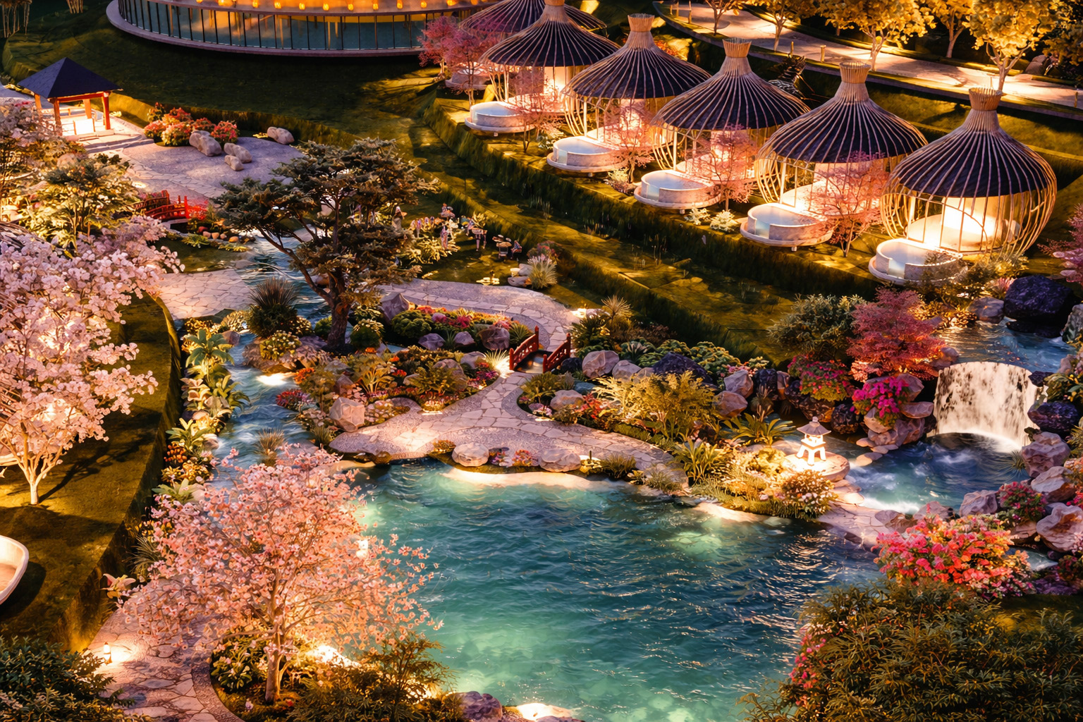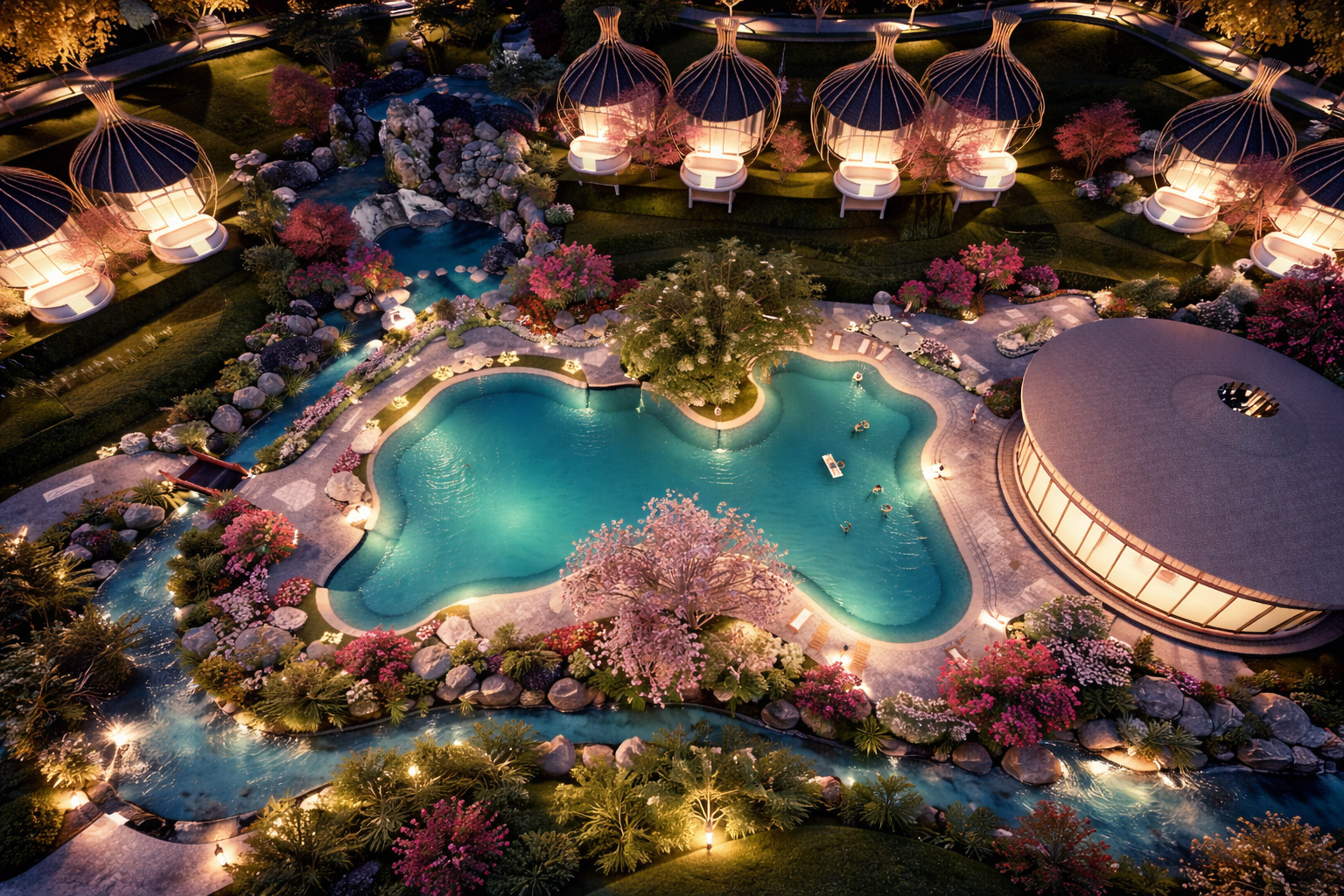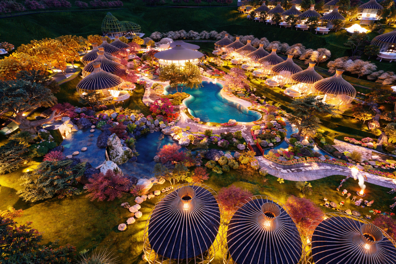 Hệ thống nước (thác – hồ – suối – bể bơi) đóng vai trò như một “trục mềm”, liên kết toàn bộ không gian.