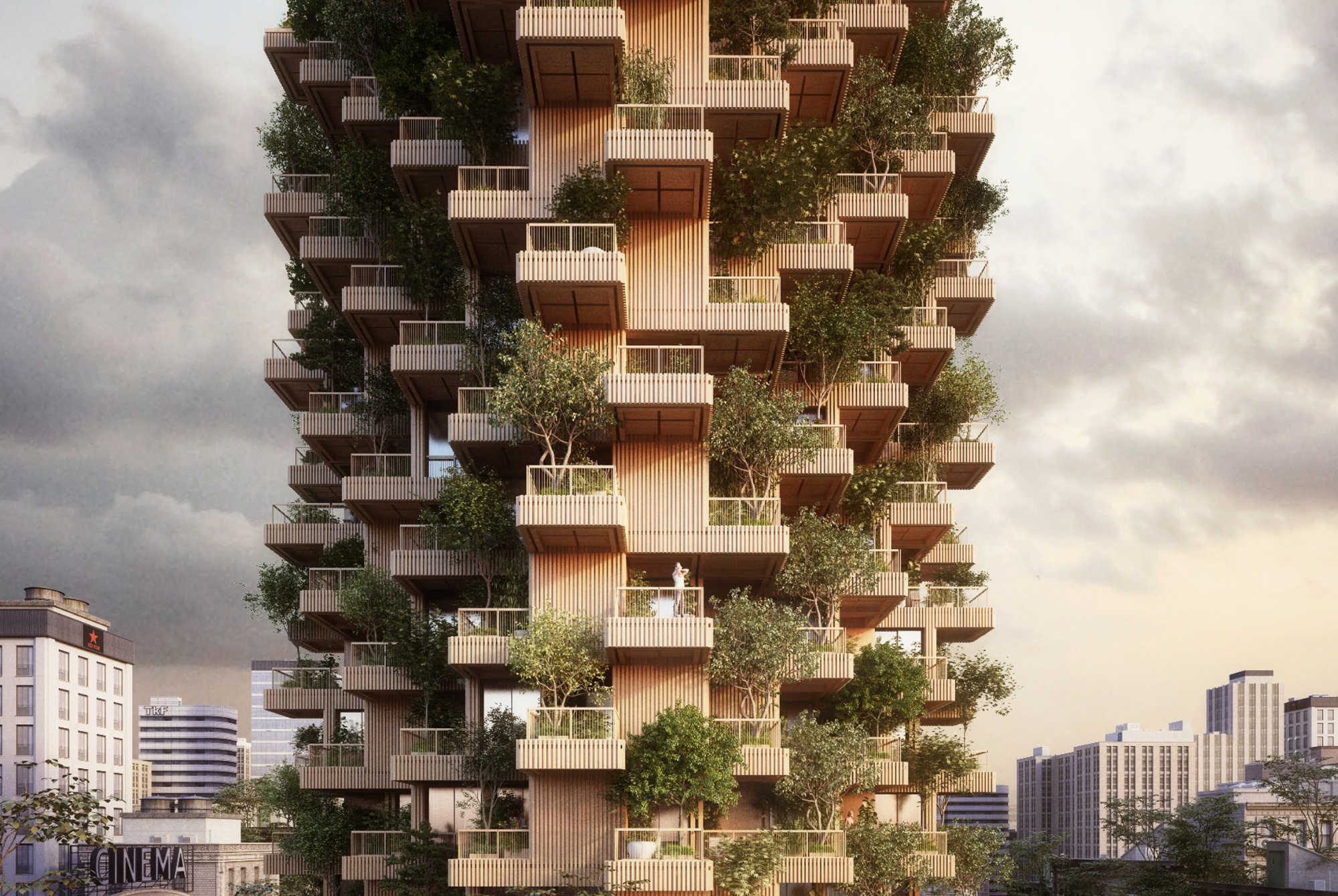 Toronto Tree Tower là công trình của kiến trúc sư người Áo Chris Precht. Khu dân cư được xây bằng gỗ với những bức tường so le và cây cối đâm chồi nảy lộc từ các ban công rộng rãi.