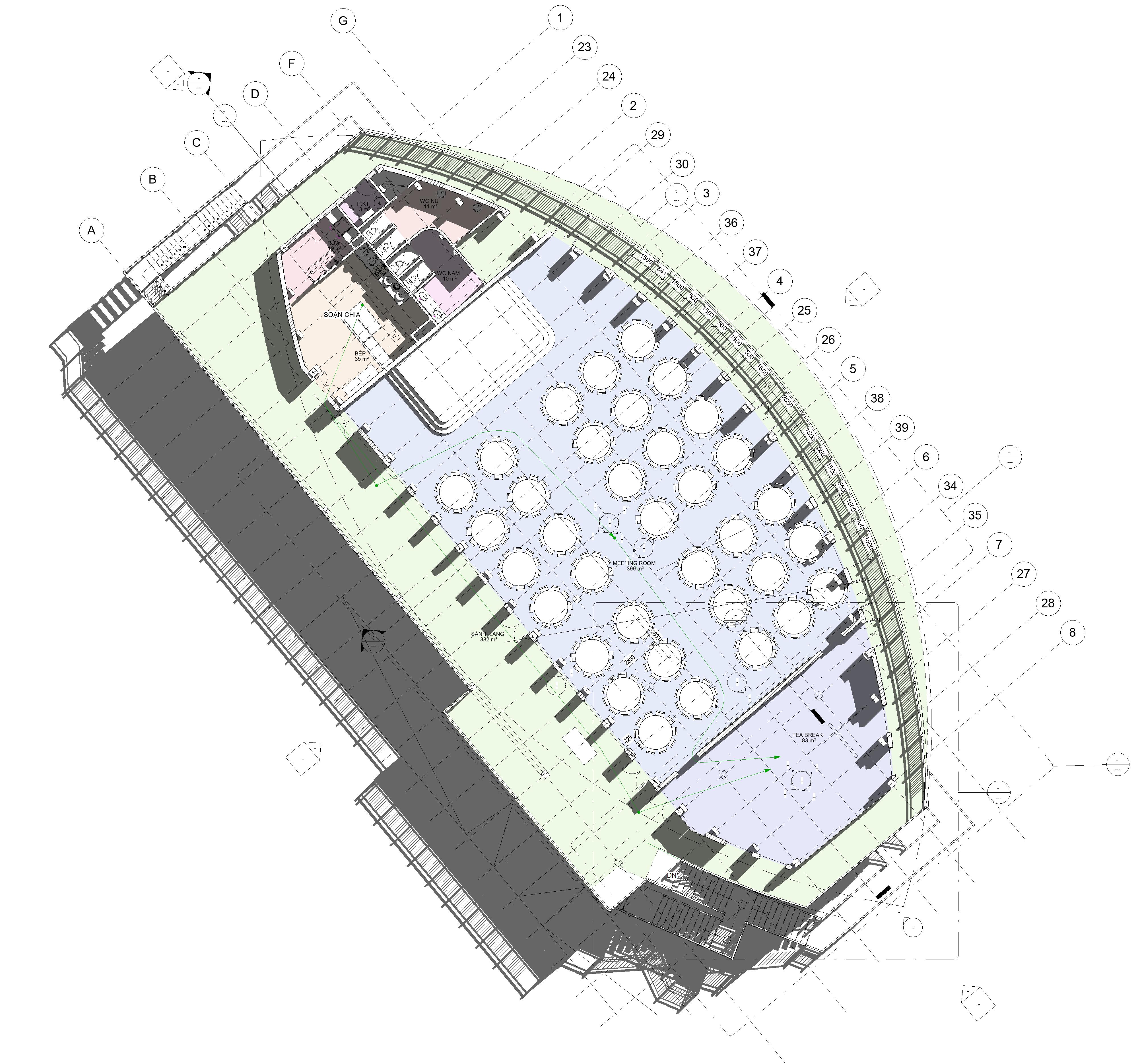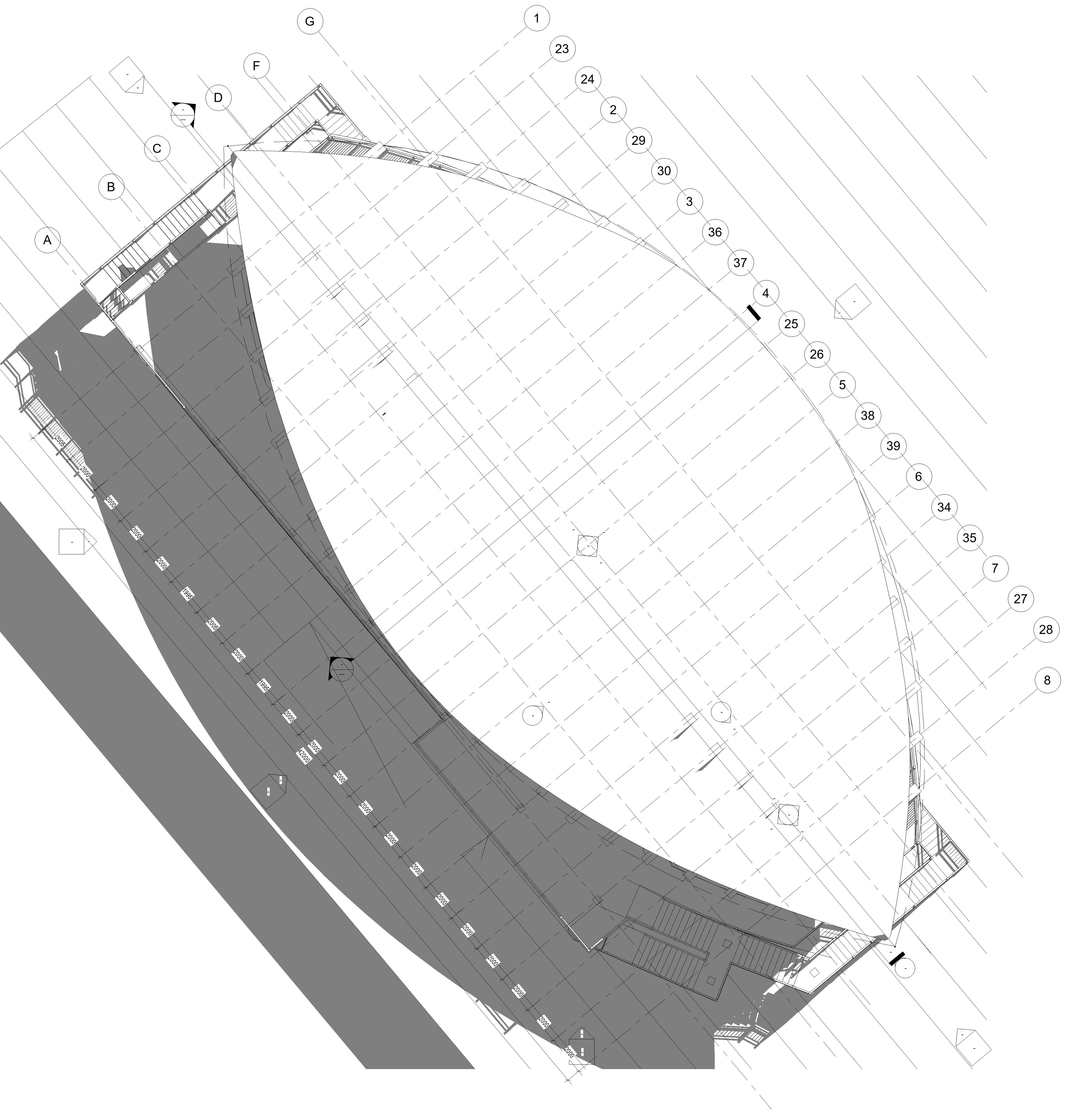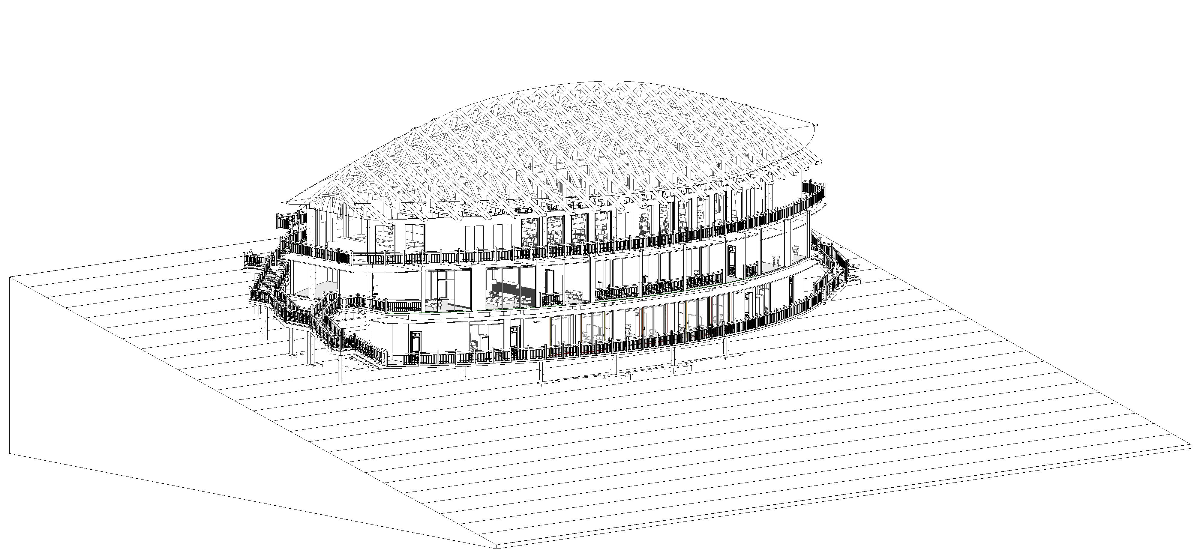 Công trình hội trường được bố trí tại vị trí cao nhất trong tổng thể khu nghỉ dưỡng, tận dụng tối đa địa hình tự nhiên với độ dốc lớn. Thiết kế dạng cánh cung ôm theo đường đồng mức giúp công trình: