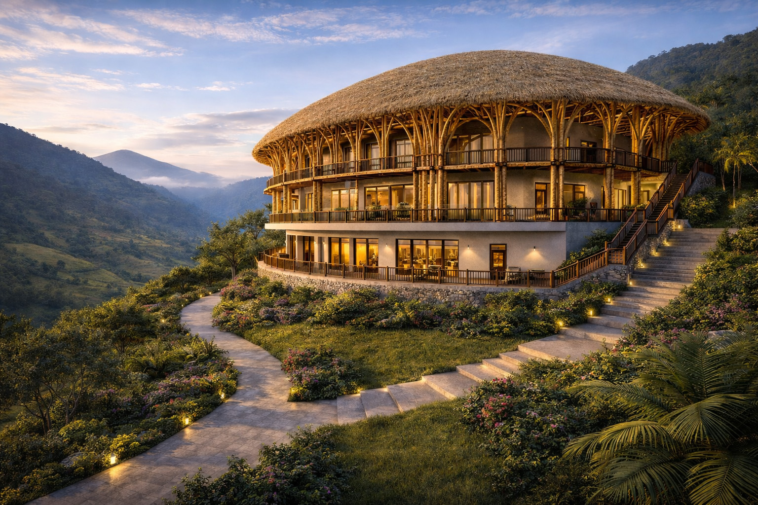 Nằm trên triền đồi thoải hướng về thung lũng Mù Cang Chải – nơi những dải núi trùng điệp và ruộng bậc thang tạo nên một trong những cảnh quan ngoạn mục nhất Việt Nam – hội trường trung tâm của khu nghỉ dưỡng GARYA không chỉ là một công trình chức năng, mà còn là một biểu tượng kiến trúc mang tính nhận diện mạnh mẽ, kết tinh giữa kỹ thuật hiện đại và tinh thần bản địa.