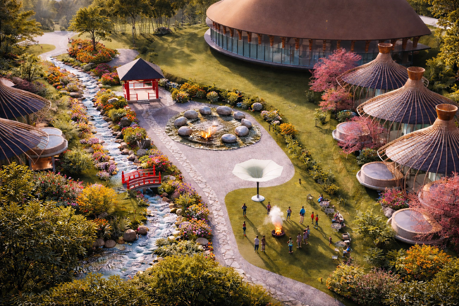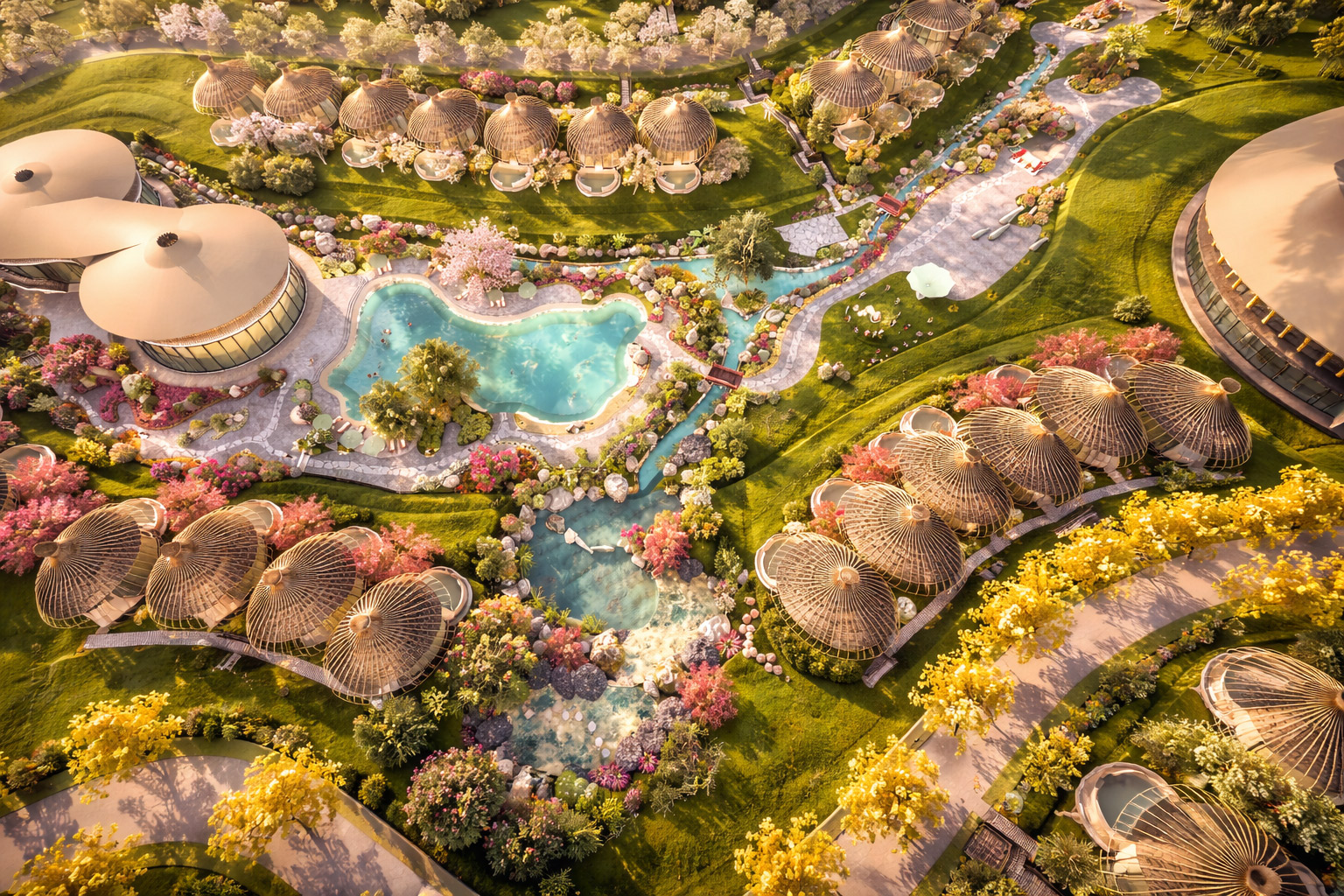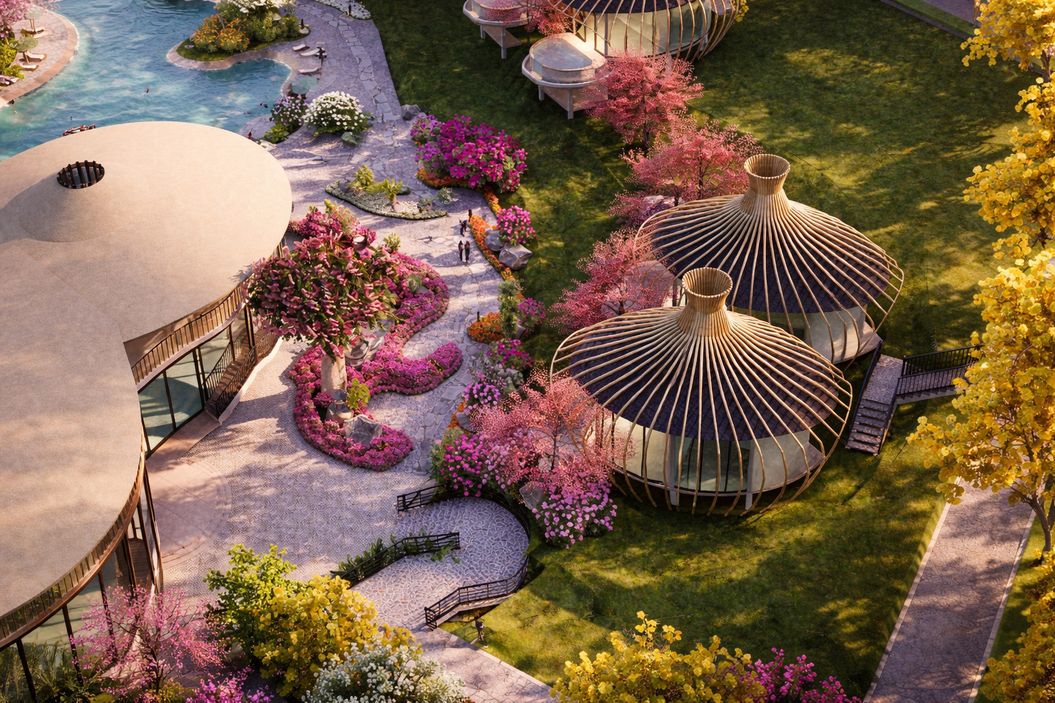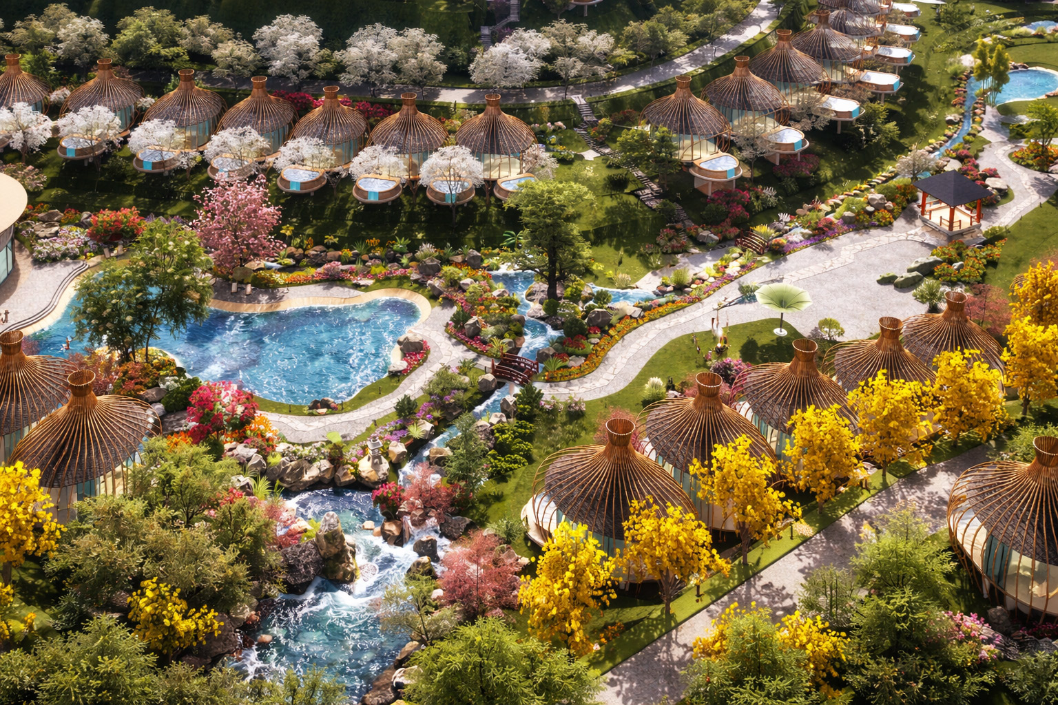 Hệ thống nước (thác – hồ – suối – bể bơi) đóng vai trò như một “trục mềm”, liên kết toàn bộ không gian.