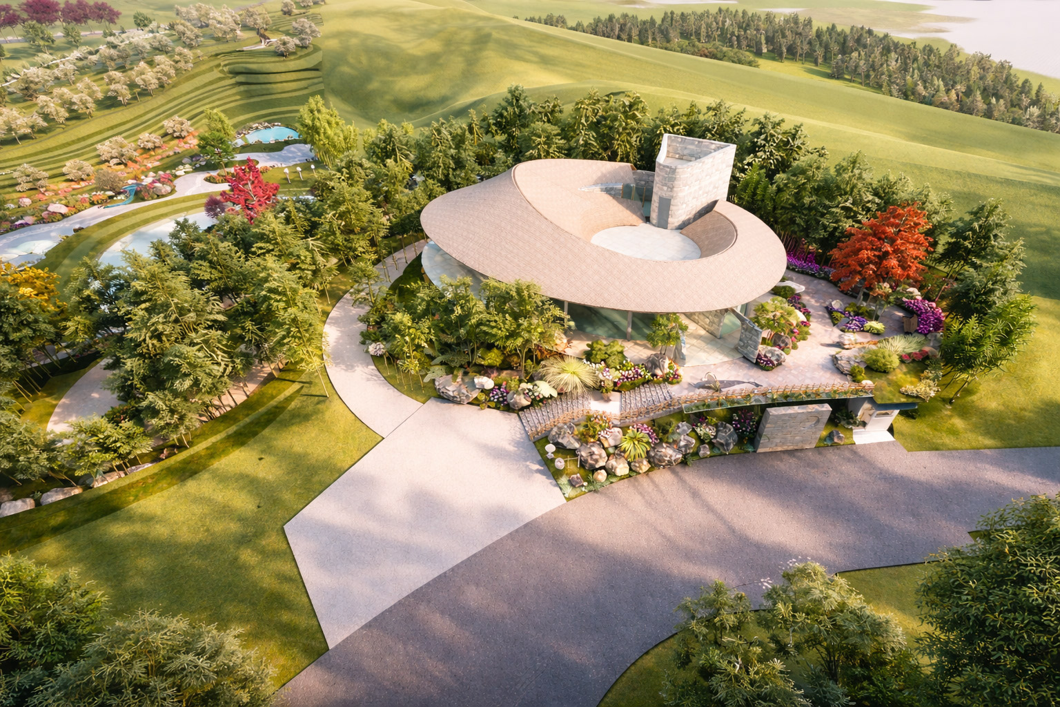 Các lớp này được kết nối bằng hệ thống đường dạo mềm mại, tạo thành hành trình liên tục.