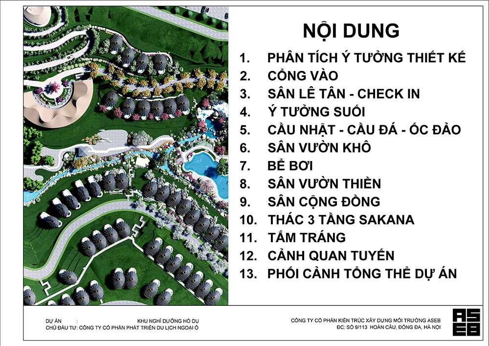 Dự án được tổ chức theo mô hình resort phân tán, mật độ xây dựng thấp, trong đó cảnh quan và yếu tố tự nhiên chiếm vai trò chủ đạo. Các công trình kiến trúc được bố trí theo địa hình, tạo thành một hệ sinh thái không gian liên tục, hạn chế tối đa sự can thiệp thô vào tự nhiên.