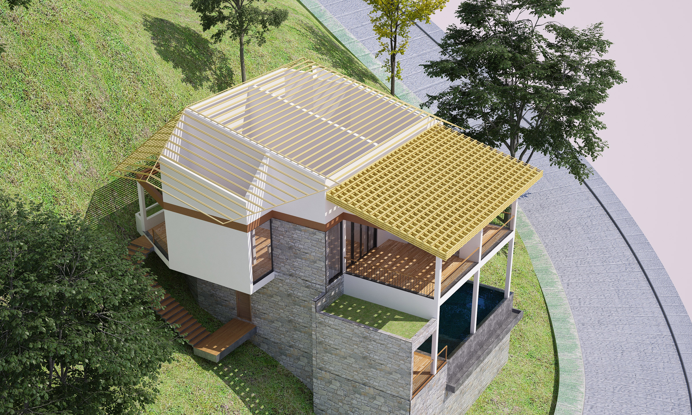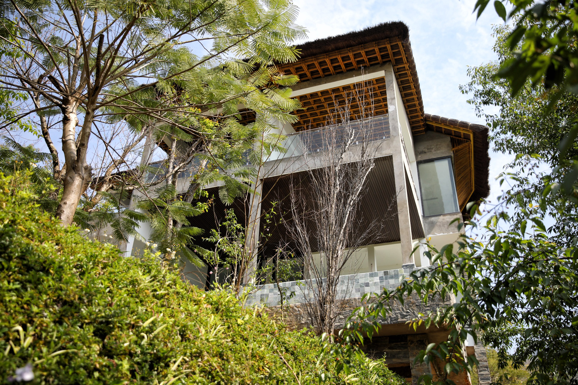 • Mái dốc kết hợp vật liệu bản địa giúp công trình hòa vào cảnh quan