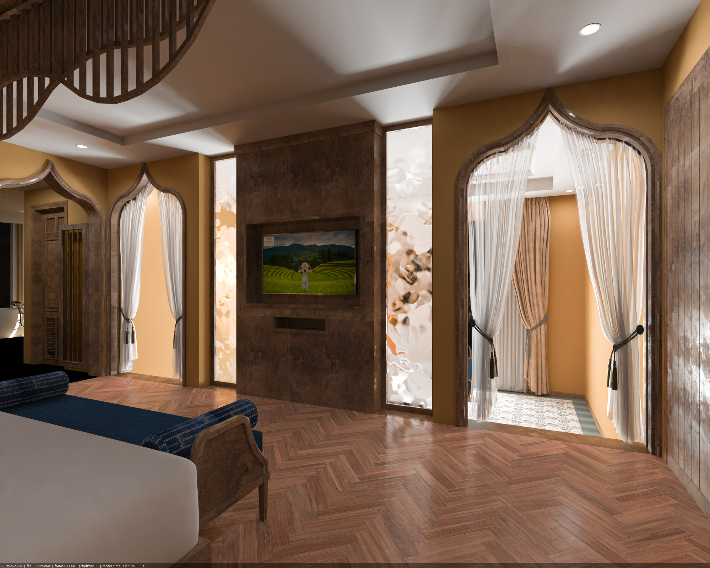 Biệt thự cao cấp 03 được thiết kế như một hệ không gian phân tầng bám theo địa hình tự nhiên của sườn đồi Mù Cang Chải. Thay vì tạo một khối nhà đơn lẻ, công trình phát triển theo chiều đứng và chiều sâu, mang đến trải nghiệm sống đa lớp, nơi mỗi cao độ là một góc nhìn và một trạng thái khác nhau.